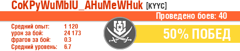 | Класс | Нация | Уровень | Корабль | Боев | Процент побед | Опыт | Урон | Потоплено кораблей | Урон по засвету | Выжил | Сбито самолетов | Выстрелов | Точность | Захват | Защита | Потенциалка | Засвечено кораблей | Рекорд опыта | Рекорд урона | Рекорд потопленных кораблей | Рекорд сбитых самолётов | Рекорд потенциалки | Рекорд засвеченных | Рекорд урона по засвету | Убил/Убит | PRO alfa | последний бой |