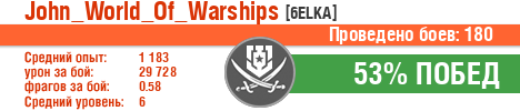 | Класс | Нация | Уровень | Корабль | Боев | Процент побед | Опыт | Урон | Потоплено кораблей | Урон по засвету | Выжил | Сбито самолетов | Выстрелов | Точность | Захват | Защита | Потенциалка | Засвечено кораблей | Рекорд опыта | Рекорд урона | Рекорд потопленных кораблей | Рекорд сбитых самолётов | Рекорд потенциалки | Рекорд засвеченных | Рекорд урона по засвету | Убил/Убит | PRO alfa | последний бой |