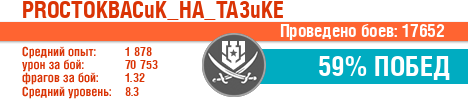 | Класс | Нация | Уровень | Корабль | Боев | Процент побед | Опыт | Урон | Потоплено кораблей | Урон по засвету | Выжил | Сбито самолетов | Выстрелов | Точность | Захват | Защита | Потенциалка | Засвечено кораблей | Рекорд опыта | Рекорд урона | Рекорд потопленных кораблей | Рекорд сбитых самолётов | Рекорд потенциалки | Рекорд засвеченных | Рекорд урона по засвету | Убил/Убит | PRO alfa | последний бой |