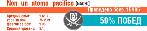 | Класс | Нация | Уровень | Корабль | Боев | Процент побед | Опыт | Урон | Потоплено кораблей | Урон по засвету | Выжил | Сбито самолетов | Выстрелов | Точность | Захват | Защита | Потенциалка | Засвечено кораблей | Рекорд опыта | Рекорд урона | Рекорд потопленных кораблей | Рекорд сбитых самолётов | Рекорд потенциалки | Рекорд засвеченных | Рекорд урона по засвету | Убил/Убит | PRO alfa | последний бой |