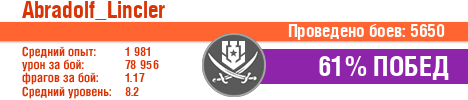| Класс | Нация | Уровень | Корабль | Боев | Процент побед | Опыт | Урон | Потоплено кораблей | Урон по засвету | Выжил | Сбито самолетов | Выстрелов | Точность | Захват | Защита | Потенциалка | Засвечено кораблей | Рекорд опыта | Рекорд урона | Рекорд потопленных кораблей | Рекорд сбитых самолётов | Рекорд потенциалки | Рекорд засвеченных | Рекорд урона по засвету | Убил/Убит | PRO alfa | Последний бой |