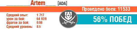 | Класс | Нация | Уровень | Корабль | Боев | Процент побед | Опыт | Урон | Потоплено кораблей | Урон по засвету | Выжил | Сбито самолетов | Выстрелов | Точность | Захват | Защита | Потенциалка | Засвечено кораблей | Рекорд опыта | Рекорд урона | Рекорд потопленных кораблей | Рекорд сбитых самолётов | Рекорд потенциалки | Рекорд засвеченных | Рекорд урона по засвету | Убил/Убит | PRO alfa | последний бой |