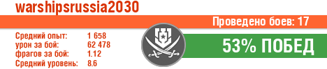 | Класс | Нация | Уровень | Корабль | Боев | Процент побед | Опыт | Урон | Потоплено кораблей | Урон по засвету | Выжил | Сбито самолетов | Выстрелов | Точность | Захват | Защита | Потенциалка | Засвечено кораблей | Рекорд опыта | Рекорд урона | Рекорд потопленных кораблей | Рекорд сбитых самолётов | Рекорд потенциалки | Рекорд засвеченных | Рекорд урона по засвету | Убил/Убит | PRO alfa | последний бой |