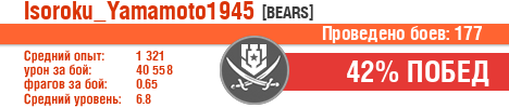 | Класс | Нация | Уровень | Корабль | Боев | Процент побед | Опыт | Урон | Потоплено кораблей | Урон по засвету | Выжил | Сбито самолетов | Выстрелов | Точность | Захват | Защита | Потенциалка | Засвечено кораблей | Рекорд опыта | Рекорд урона | Рекорд потопленных кораблей | Рекорд сбитых самолётов | Рекорд потенциалки | Рекорд засвеченных | Рекорд урона по засвету | Убил/Убит | PRO alfa | последний бой |