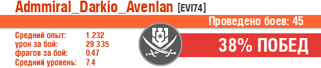 | Класс | Нация | Уровень | Корабль | Боев | Процент побед | Опыт | Урон | Потоплено кораблей | Урон по засвету | Выжил | Сбито самолетов | Выстрелов | Точность | Захват | Защита | Потенциалка | Засвечено кораблей | Рекорд опыта | Рекорд урона | Рекорд потопленных кораблей | Рекорд сбитых самолётов | Рекорд потенциалки | Рекорд засвеченных | Рекорд урона по засвету | Убил/Убит | PRO alfa | последний бой |