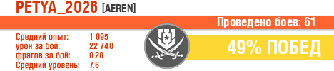 | АВ | ussr | 8 | Победа | 6 | 66.67 | 1124 | 8711 | 0 | 0 | 33.33 | 2.5 | 0 | 0 | 0 | 0 | 304283 | 4.5 | 1532 | 24789 | 0 | 7 | 486600 | 7 | 0 | 0 | 0 | 2026-03-31 10:13:52 |