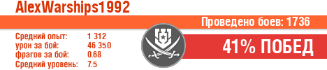 | Класс | Нация | Уровень | Корабль | Боев | Процент побед | Опыт | Урон | Потоплено кораблей | Урон по засвету | Выжил | Сбито самолетов | Выстрелов | Точность | Захват | Защита | Потенциалка | Засвечено кораблей | Рекорд опыта | Рекорд урона | Рекорд потопленных кораблей | Рекорд сбитых самолётов | Рекорд потенциалки | Рекорд засвеченных | Рекорд урона по засвету | Убил/Убит | PRO alfa | последний бой |