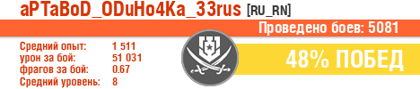| КР | ussr | 8 | Багратион | 5 | 40 | 1755 | 56046 | 0.8 | 4397 | 0 | 8.6 | 188 | 38.76 | 7.6 | 4.8 | 479843 | 0.2 | 2731 | 105704 | 2 | 39 | 690934 | 1 | 19013 | 0.8 | 2461 | 2023-02-21 07:40:26 |